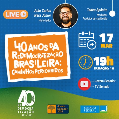 Para marcar as quatro décadas da redemocratização no Brasil, o Programa Jovem Senador promove na próxima segunda-feira (17), às 19h, uma roda de conversa com transmissão ao vivo pelo YouTube da TV Senado, aberta a todos. O encontro, intitulado “40 anos da redemocratização brasileira: caminhos percorridos”, terá a participação do historiador João Carlos Nara.