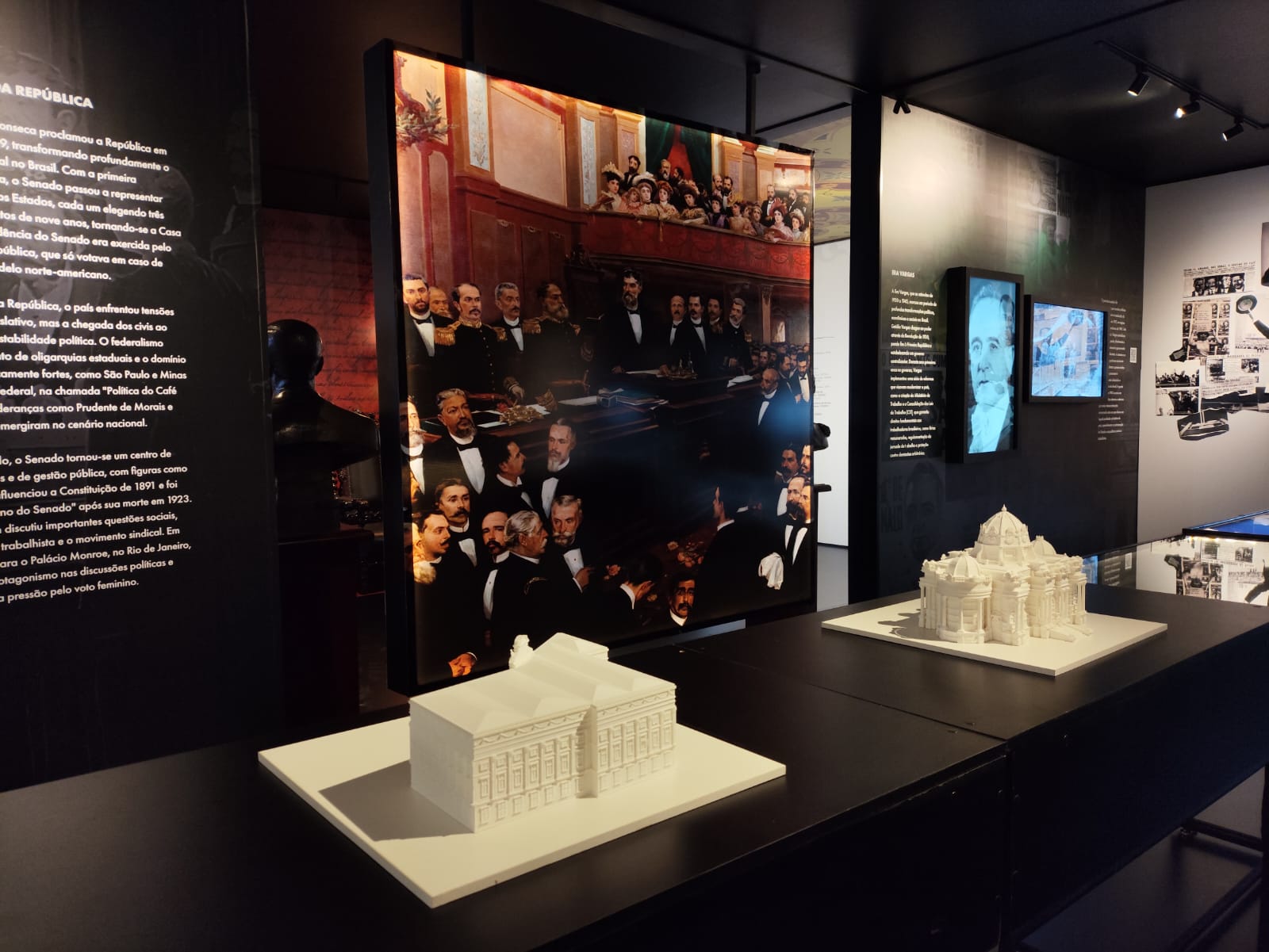 O público visitante conhecerá as maquetes dos três palácios do Senado Federal: Conde dos Arcos, Monroe e Congresso Nacional. Das duas primeiras sedes, situadas no Rio de Janeiro, estarão expostas antiguidades, como aparadores, cadeiras, bustos de personalidades históricas e urnas de prata. Do Palácio Monroe, também serão exibidos três lustres monumentais e uma parte do vitral com a representação alegórica da Proclamação da República, desenhado por Henrique Campos Cavaleiro e executado pela firma Formenti e Cia., em 1930.