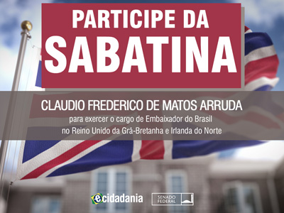 Sabatina Sabatina de Claudio Frederico de Matos Arruda, indicado para exercer o cargo de Embaixador do Brasil no Reino Unido da Grã-Bretanha e Irlanda do Norte Previous Next