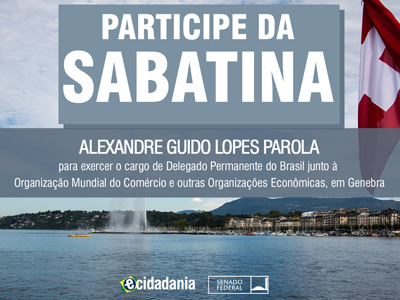 Sabatina Sabatina de Alexandre Guido Lopes Parola, indicado para exercer o cargo de Delegado Permanente do Brasil junto à Organização Mundial do Comércio e outras Organizações Econômicas, em Genebra Previous Next