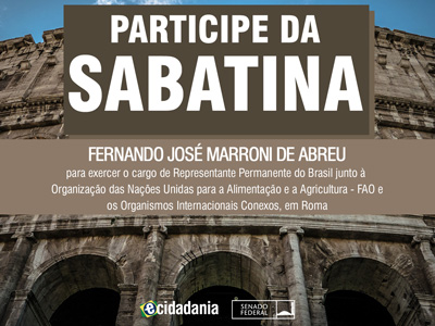 Sabatina Sabatina de Fernando José Marroni de Abreu, indicado para exercer o cargo de Representante Permanente do Brasil junto à Organização das Nações Unidas para a Alimentação e a Agricultura em Roma Previous Next
