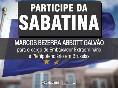 Sabatina Sabatina de Marcos Bezerra Abbott Galvão, indicado para o cargo de Embaixador Extraordinário e Plenipotenciário, Chefe da Missão do Brasil junto à União Europeia, em Bruxelas Previous Next