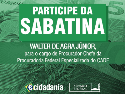 Sabatina Sabatina de Walter de Agra Júnior, indicado ao cargo de Procurador-Chefe da Procuradoria Federal Especializada do Conselho Administrativo de Defesa Econômica Previous Next