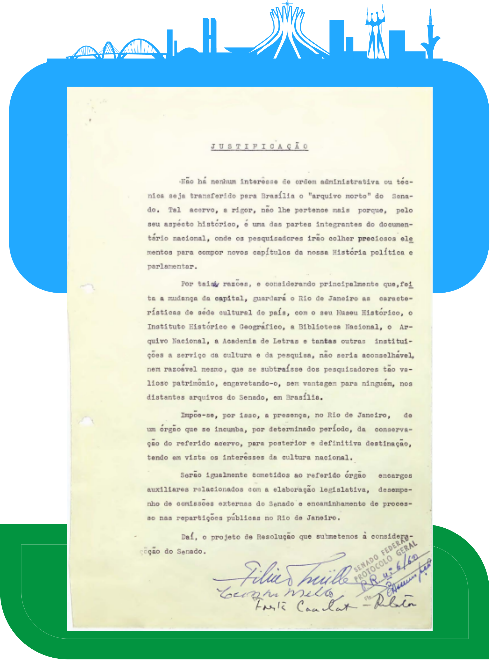 O mais interessante desse projeto, porém, é a sua justificação. Para a manutenção do Arquivo no Rio de Janeiro, os senadores enfatizaram o caráter histórico da documentação. Como se pode observar, tal valor é reforçado, pois o Arquivo do Senado Federal é comparado a outras instituições culturais, como o Museu Histórico, o Instituto Histórico e Geográfico Brasileiro, a Biblioteca Nacional, o Arquivo Nacional e a Academia Brasileira de Letras.