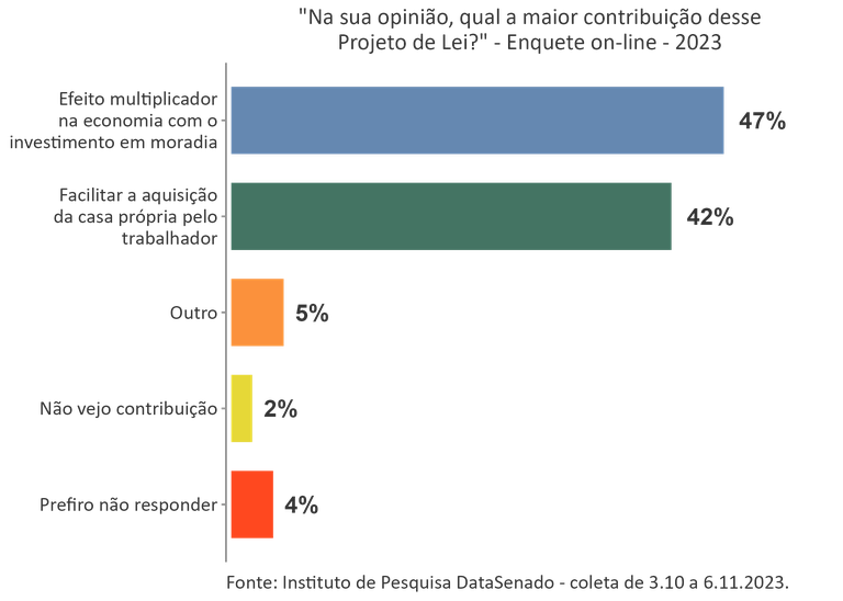 Na opinião dos participantes, a maior contribuição do referido Projeto de Lei é o “Efeito multiplicador na economia com o investimento em moradia”, apontada por 47% dos internautas. Em seguida está a possibilidade de “Facilitar a aquisição da casa própria pelo trabalhador”, indicada por 42% dos respondentes.