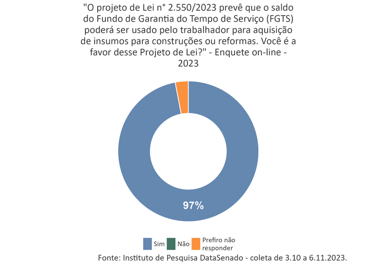 De acordo com a enquete, a maioria dos respondentes (97%) é a favor do Projeto de Lei n° 2.550/2023 que prevê que o saldo do Fundo de Garantia do Tempo de Serviço (FGTS) possa ser usado pelo trabalhador para aquisição de insumos para construções ou reformas.