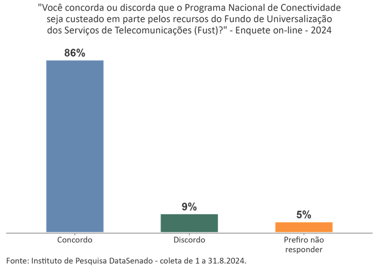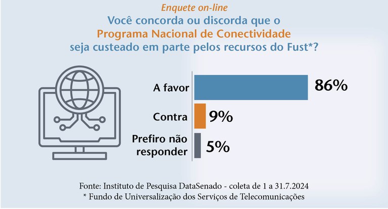 Enquete on-line realizada pelo DataSenado mostra que 86% dos entrevistados concordam que o Programa Nacional de Conectividade deveria ser custeado em parte pelos recursos do Fundo de Universalização dos Serviços de Telecomunicações (Fust).