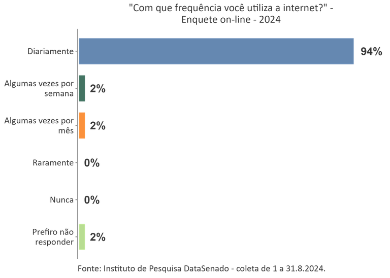 De acordo com a enquete, 94% dos entrevistados afirmam utilizar a internet diariamente, 2% algumas vezes por semana e 2% algumas vezes no mês. Quando perguntados sobre a forma de utilização, 25% dos participantes declaram ficar a maior parte do tempo utilizando a internet para trabalho, 21% para entretenimento e 20% para estudo.