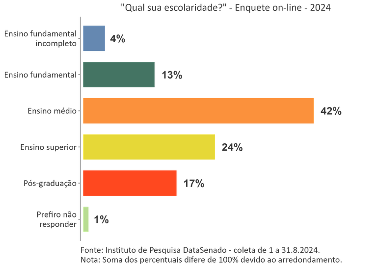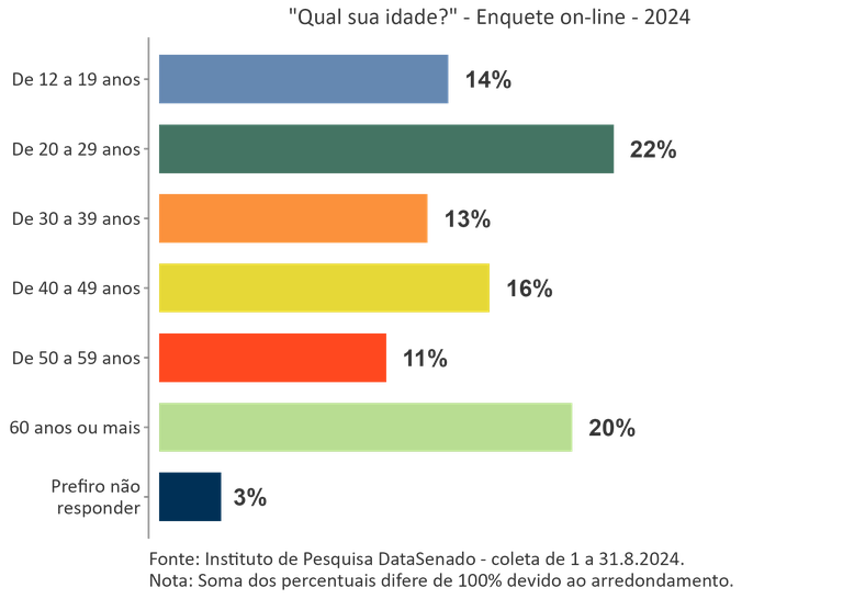 Os resultados refletem a opinião dos internautas que participaram da enquete no portal do Senado Federal. Os números não representam a opinião da totalidade da população brasileira. Os valores percentuais foram arredondados de maneira que a soma dos percentuais de alguns gráficos pode ser diferente de 100%, para mais ou para menos.