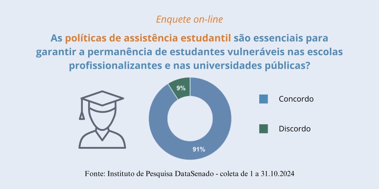 Enquete on-line realizada pelo DataSenado mostra que 91% dos entrevistados concordam que “as políticas de assistência estudantil são essenciais para garantir a permanência de estudantes vulneráveis nas escolas profissionalizantes e nas universidades públicas”.