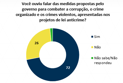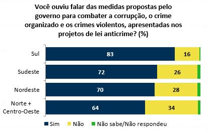 Os resultados mostram que as medidas propostas para combater a corrupção, o crime organizado e os crimes violentos já são do conhecimento de 72% dos entrevistados. Os que mais se interessam pelo assunto são os moradores da região Sul (83%) e os brasileiros com 60 anos ou mais (84%).
