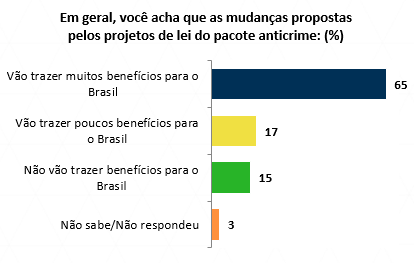 Quando indagados sobre os possíveis efeitos dos projetos de lei, a grande maioria que ouviu falar neles acredita que vão trazer muitos benefícios (65%). Outros 17% são mais céticos, mas ainda assim acreditam que as medidas trarão poucos benefícios. Apenas 15% dos entrevistados afirmaram não acreditar que alguma coisa mudará com aprovação do projeto de Moro.