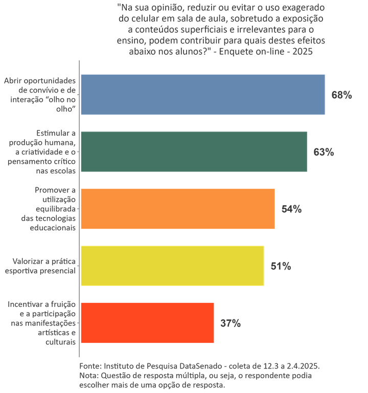 A interação “olho no olho” entre alunos e alunas foi o efeito mais apontado pelos respondentes (68%) com a proibição do uso de tablets e celulares. Já ampliar o analfabetismo digital foi o efeito menos frequente (6%).