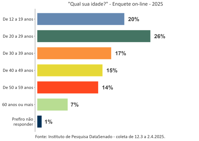 A enquete ficou disponível no Portal do DataSenado de 12.03 a 02.04 de 2025 e contou com 111 participantes, sendo a maioria composta por pessoas do sexo masculino (57%), da cor branca (56%), abaixo dos 39 anos (63%), com ensino médio completo ou mais (87%), conforme detalhado nos gráficos abaixo.