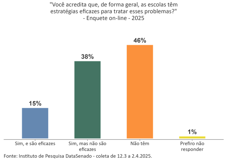 A maioria dos respondentes, 53%, acredita que as escolas possuem estratégias para atingir as melhorias que a lei prevê, mas apenas 15% entendem que essas estratégias são eficazes.