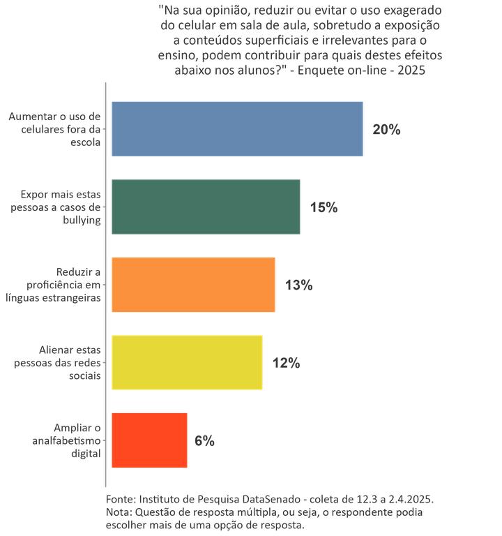 Enquete on-line realizada pelo DataSenado mostra que 84% dos respondentes têm conhecimento da distração de crianças e adolescentes por uso do celular em sala de aula.