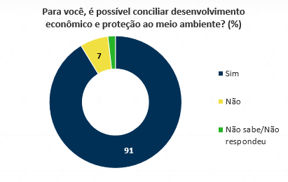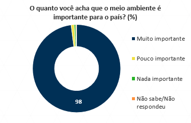 Para 98% brasileiros, o meio ambiente é muito importante para o país e mais de 90% acreditam que é possível conciliar o desenvolvimento econômico com a preservação ambiental. No entanto, nove em cada dez pessoas acham que o meio ambiente não está sendo protegido adequadamente.