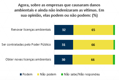 Quando perguntados sobre as empresas que causaram danos ambientais e ainda não indenizaram as vítimas, a maioria é a favor que elas sejam impedidas tanto de renovar licenças (65%) quanto de obter novas licenças ambientais (66%). Para 66% essas empresas também não deveriam ser contratadas pelo Poder Público.