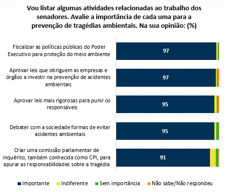 Para 85% das pessoas ouvidas, o trabalho dos senadores pode ajudar a evitar tragédias ambientais. Sobre as possíveis iniciativas parlamentares sobre o assunto, todas foram apontadas como importantes por mais de 90% dos participantes.