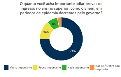 A última pesquisa realizada pelo Instituto DataSenado mostra que 75% dos brasileiros acham muito importante adiar provas de ingresso no ensino superior, como o Enem, em períodos de epidemia decretada pelo governo. A medida está prevista no PL 1.277/2020, de autoria da senadora Daniella Ribeiro (PP-PB), e foi aprovada pelo Senado no dia 19 de maio. Apenas aproximadamente 2 em cada 10 cidadãos acham a proposta pouco ou nada importante.