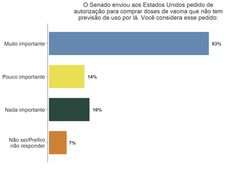 Com vistas a reforçar a vacinação contra a Covid-19 no Brasil, o presidente do Senado Federal, Rodrigo Pacheco (DEM∕MG), solicitou ao Congresso dos Estados Unidos autorização para comprar o estoque de vacinas americano que não tenha previsão de uso naquele país. Dados da pesquisa mostram que a medida é considerada muito importante por 63% dos brasileiros.