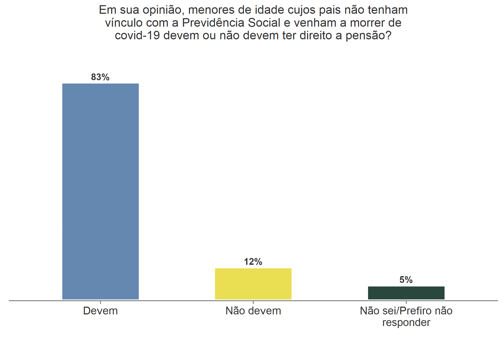 A maioria dos brasileiros (83%) também é a favor da concessão de pensão por morte a criança ou adolescente cujo genitor, desde que não filiado a regime de previdência social, venha a falecer em decorrência do coronavírus. A prestação do benefício foi proposta pelo senador Rogério Carvalho (PT/SE), por meio do PL 887/2021.