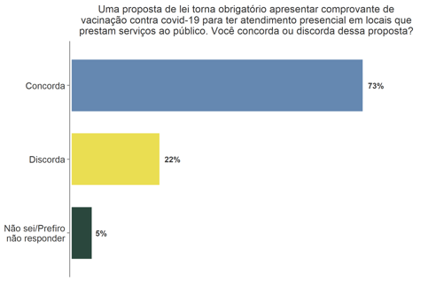 Em relação à circulação de pessoas já vacinadas contra a Covid-19, a maioria dos brasileiros (73%) concorda que seja exigida delas a apresentação de comprovante de imunização como requisito para acesso a locais que prestam atendimento à população. A medida está prevista no PL 883/2021, proposto pelo senador Jader Barbalho (MDB/PA), e deve valer para pessoas da faixa etária em que a vacinação já tenha sido feita.