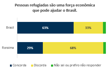 Brasileiros e moradores de Roraima divergem quanto aos impactos econômicos da presença de refugiados. Se por um lado 63% dos brasileiros acreditam que pessoas refugiadas são uma força econômica que pode ajudar o país, apenas 29% dos roraimenses concordam com essa afirmativa. Existe, também, uma diferença em relação à crença de que refugiados se integram bem à sociedade: 72% dos participantes do bloco feito em todas as UFs concordam com essa afirmação, percentual este menor entre os habitantes de Roraima (47%).