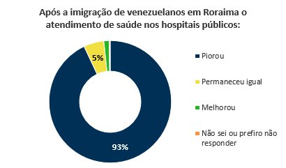 No que diz respeito aos serviços de saúde, 59% da população brasileira em geral acha que a entrada dos refugiados sobrecarrega os hospitais públicos. Já 91% dos entrevistados em Roraima concordam com essa afirmação. Além disso, no bloco de pesquisa feito apenas com moradores de Roraima, 93% afirmaram que o atendimento de saúde prestado pelos hospitais públicos piorou após a chegada dos Venezuelanos no estado.