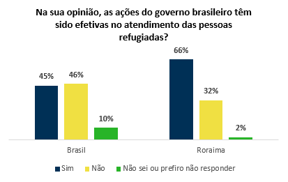 No bloco de pesquisa nacional, as opiniões ficaram divididas quanto à efetividade das ações do governo brasileiro no atendimento das pessoas refugiadas: 45% acreditam que elas são efetivas e 46% acreditam que não. Por outro lado, no bloco aplicado em Roraima, dois terços dos entrevistados concordam com essa afirmativa. Além disso, os roraimenses estão mais a par do assunto, pois apenas 2% não se posicionaram sobre o tema, percentual que chega a 10% no Brasil.