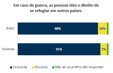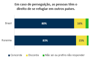 No bloco nacional, 88% dos entrevistados acreditam que as pessoas têm o direito de se refugiar para escapar de guerras e 80% acreditam que as pessoas têm o direito de se refugiar para escapar de perseguição. Esse padrão de resposta se repetiu no bloco realizado com moradores de Roraima, porém a concordância foi ainda maior.