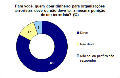 Sobre a pena para quem cometer terrorismo, 69% posicionaram-se a favor de ser a maior prevista no Código Penal para um crime, ou seja, 30 anos. Outros 83% defendem que quem doar dinheiro para organizações terroristas deve ter punição igual a de um terrorista.