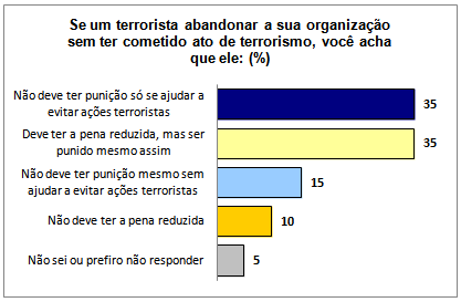 Já se um terrorista abandonar sua organização sem ter cometido ato de terrorismo, 35% dos internautas opinaram que ele não deve ser punido apenas se ajudar a evitar ações terroristas; 15% acreditam que, mesmo que ele não auxilie na prevenção de ataques, ele não deve ser punido. Outros 35% concordam que ele tenha a pena reduzida, mas ainda seja punido, já 10% defendem que ele não tenha a pena reduzida.