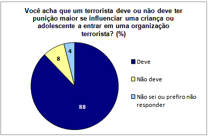Ainda 88% afirmaram que o terrorista que influenciar uma criança ou adolescente a entrar em sua organização deve ter pena maior.