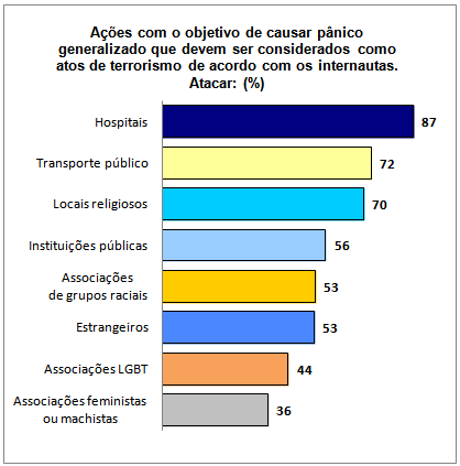 Os participantes também indicaram, em percentuais menores, ataques a outros locais que devem ser considerados terrorismo: ataque a instituições públicas, impedindo seu funcionamento foi indicado por 56%, seguido por ataque a associações de grupos raciais e a estrangeiros, ambos indicados por 53%.