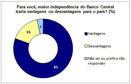 Os resultados também indicam que 81% dos participantes acreditam que maior independência do BC traria vantagens para o país. Em contrapartida, 16% acham que traria desvantagens.
