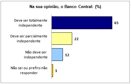 Maioria de internautas participantes de enquete disponibilizada no Portal do Senado são favoráveis à independência do Banco Central do Brasil (BC): 87% dos participantes acreditam que o BC deve ser total ou parcialmente independente, sendo que 65% apoiam sua independência total e outros 22% acham que o BC deve ser parcialmente independente. Por outro lado, 12% defendem que o BC não deve ser independente.