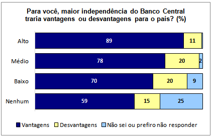 Os participantes da enquete que afirmam possuir maior conhecimento sobre o BC acreditam, em sua maioria, que uma maior independência traria vantagens ao país: 89%. Esse percentual cai entre aqueles que não possuem nenhum conhecimento sobre o BC: 59%.