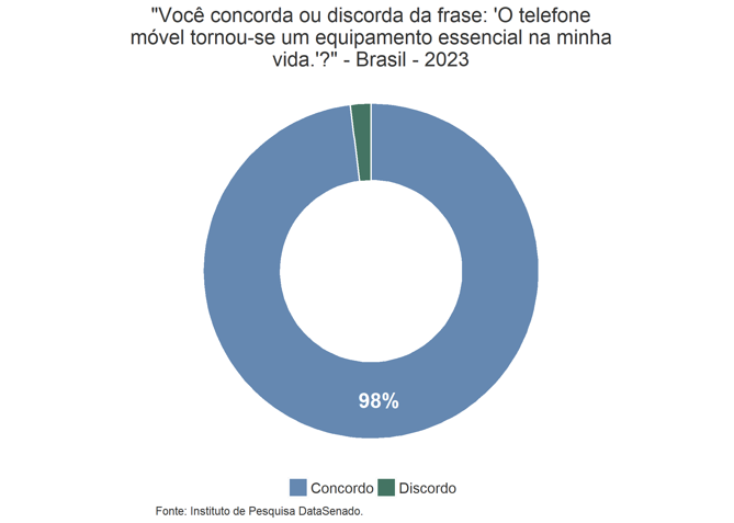 A maioria absoluta dos participantes, 98%, concorda que o telefone móvel se tornou um equipamento essencial, corroborando a justificação utilizada no projeto de lei n° 2.643, de 2022.