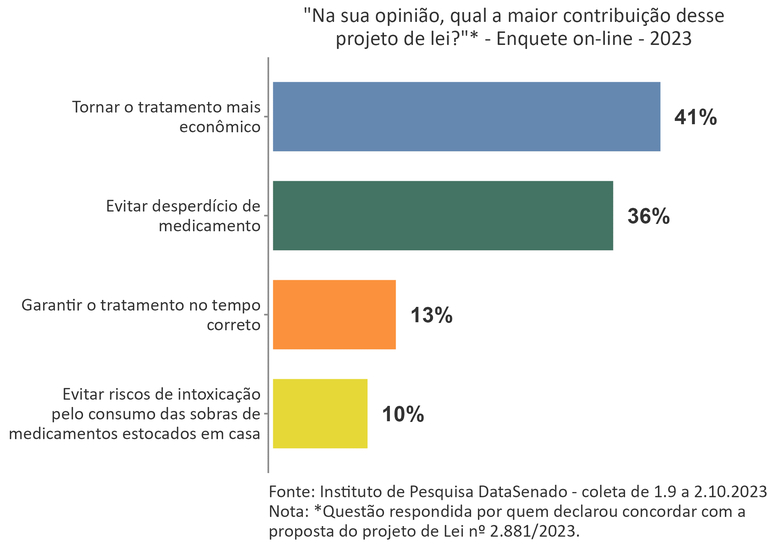 Dentre as justificações apresentadas no Projeto de Lei, as mais relevantes de acordo com os internautas são “tornar o tratamento mais econômico”, apontada por 41% dos participantes, seguida por “evitar desperdício de medicamento”, escolhida por 36% destes.