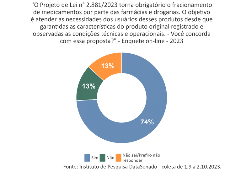 O Instituto DataSenado realizou enquete on-line para avaliar a opinião de internautas sobre o Projeto de Lei n° 2.881 de 2023 que obriga farmácias a fracionarem medicamentos para venda de acordo com a prescrição médica.