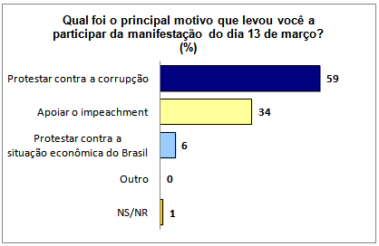 A corrupção foi apontada como motivador por 59% dos pesquisados e o impeachment da presidente da República por 34%. O protesto contra a situação econômica do país levou às ruas apenas 6% dos manifestantes. Os homens tiveram participação majoritária - foram 56% contra 44% das mulheres.