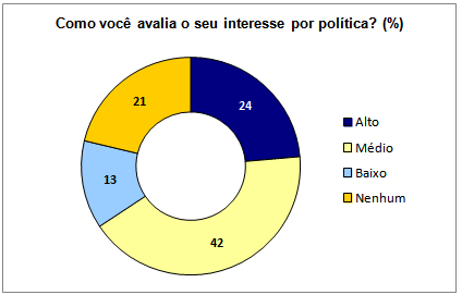 A pesquisa avaliou ainda o nível de interesse dos brasileiros pela política. A maior parte dos entrevistados afirmou ter um interesse médio por política (42%), apesar de a maioria declarar que mantém conversas sobre o tema durante mais de cinco dias na semana (34%).
