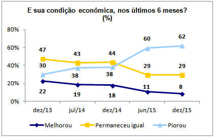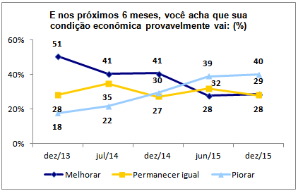 Os resultados indicam também que os brasileiros continuam pessimistas em relação ao futuro. Como foi observado na última edição da pesquisa, a maior parte dos entrevistados (40%) avalia que a sua condição econômica vai piorar nos próximos seis meses. Além disso, quando questionados sobre a sua condição econômica nos seis meses anteriores, 62% afirmaram que ela piorou.