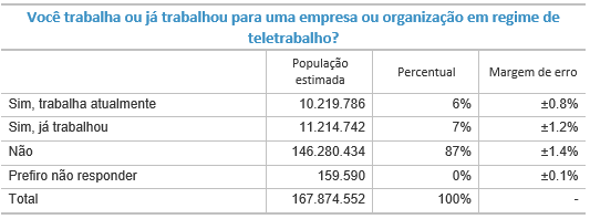 No Brasil, 13% da população têm experiência com teletrabalho. Desses, 6% trabalham a distância no atual momento, número que corresponde a aproximadamente 10 milhões de brasileiros. Além disso, 7% já trabalharam nessa modalidade, aproximadamente 11 milhões de brasileiros.