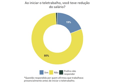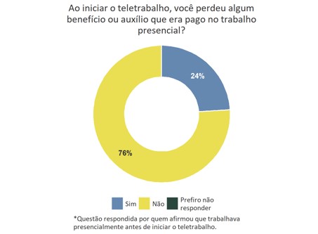Aproximadamente um em cada cinco (19%) trabalhadores remotos teve redução de salário ao iniciar o teletrabalho. Além disso, quase um quarto (24%) perdeu algum benefício ou auxílio que era pago no trabalho presencial.