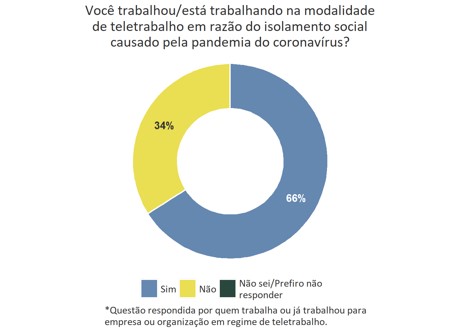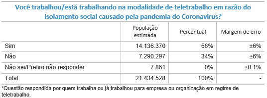 Entre os brasileiros que já trabalharam a distância, dois terços afirmam que o trabalho nessa modalidade se deu em razão do isolamento social causado pela pandemia do coronavírus. Esse número corresponde a uma estimativa de 14 milhões de brasileiros.