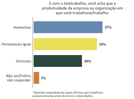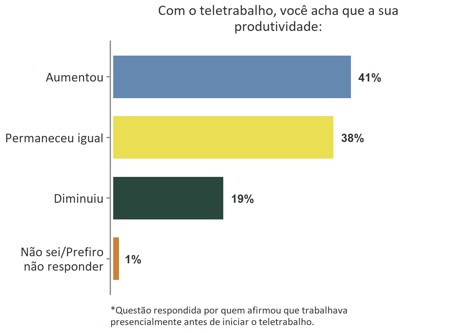 A maioria dos trabalhadores remotos afirma que houve aumento de produtividade com o teletrabalho, tanto em relação ao próprio desempenho (41%) quanto em relação ao da empresa ou organização empregadora (38%).