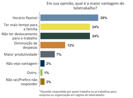 Apesar disso, sete em cada dez trabalhadores que têm experiência com trabalho remoto afirmam que se adaptar ao novo formato foi fácil. Em relação às dificuldades enfrentadas ao iniciar o teletrabalho, a mais citada foi a falta de internet de qualidade e a vantagem do teletrabalho citada em maior frequência é o horário flexível, seguida de ter mais tempo para a família.