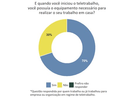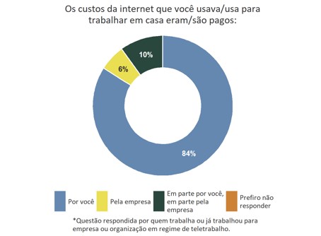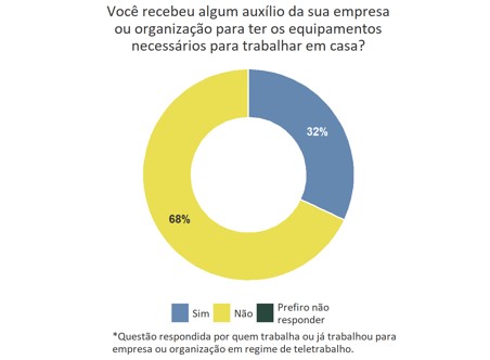 A maioria dos trabalhadores remotos (68%) não recebeu auxílio da empresa ou organização empregadora para ter os equipamentos necessários ao trabalho. Segundo os resultados, a maior parte dos trabalhadores remotos pagam a energia elétrica e a internet que utilizam para trabalhar em casa.